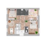 In De Omloop komen 2 Poortwoningen. Ze zijn extra breed op de 1e en 2e verdieping doordat ze hier de poort naar de garage overbruggen. Het resultaat is een unieke indeling en een zee aan ruimte. En hoe leuk dat je op de begane grond een leefkeuken hebt grenzend aan de binnentuin. Zet de deuren lekker open en geniet van de zon. De tuin ligt op het zuiden. Aan de voorzijde van het huis is een werkkamer gemaakt. Aan jou natuurlijk of je hem daar ook voor gebruikt.
