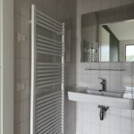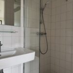 Aangrenzend aan de slaapkamer vind je de badkamer, die volledig is betegeld en beschikt over een inloopdouche, een wastafel met spiegel en een handdoekradiator. Het toilet is separaat, deels betegeld en voorzien van een fonteintje, en is bereikbaar via de hal. Ook vanuit de hal heb je toegang tot de meterkast en de stook-/bergruimte, waar tevens de aansluiting voor de wasmachine is en voldoende opbergruimte aanwezig is.