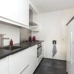 Opvallend is de grote raampartij over de hele breedte in de lichte ruime woonkamer met open keuken! De keuken is ingericht met een licht keukenmeubel in een rechte opstelling en een kastenwand, welke zijn voorzien van een 4-pits gaskookplaat, een afzuigkap, combi-oven, koelkast, vriezer, een vaatwasser en veel opbergruimte voor je kookgerei. Het keukenmeubel wordt afgetopt met een donker werkblad en er ligt een donkere laminaatvloer. De cv-ketel (Intergas 4, 2021) is opgesteld in een praktische bergkast.