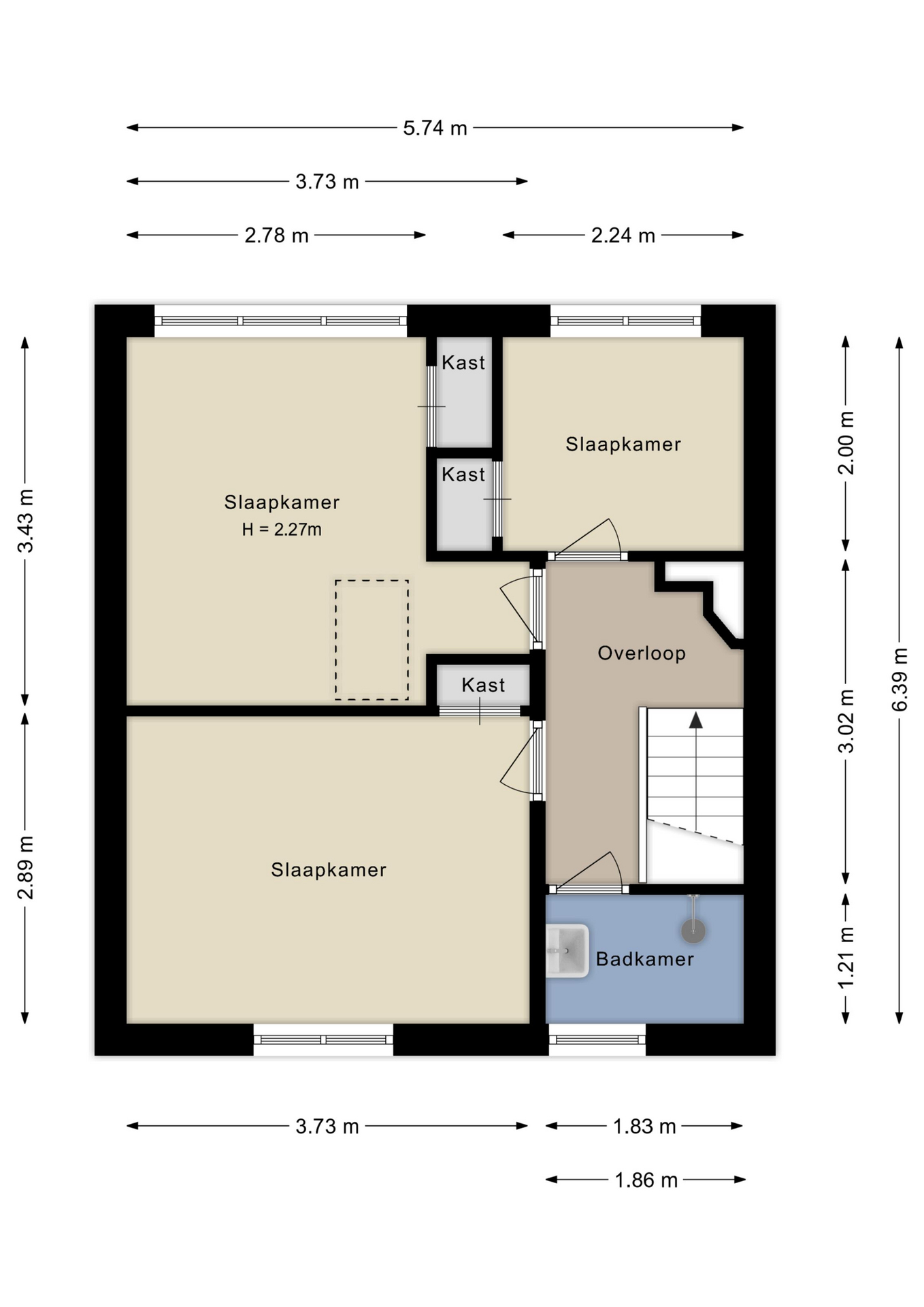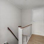 Op de overloop ligt een laminaatvloer en zijn de wanden strak afgewerkt. Er zijn drie slaapkamers: twee aan de achterzijde (waarvan één met toegang tot de vliering), en één aan de voorzijde. Alle kamers beschikken over een vaste kast. De badkamer is volledig betegeld en voorzien van een douche en wastafel.