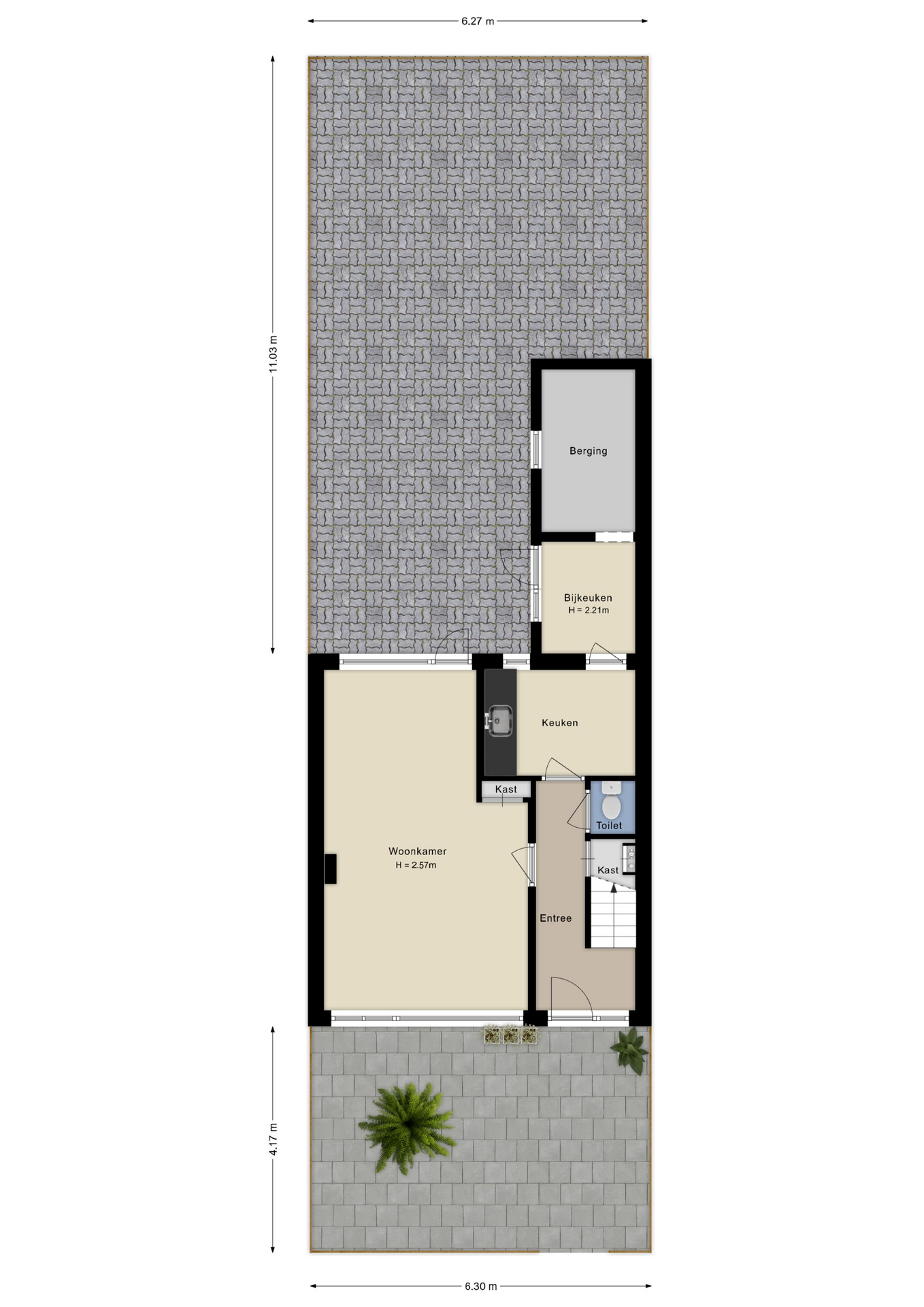 Entree via de hal met meterkast, trapopgang en toegang tot de kelder. Het toilet is separaat geplaatst. De doorzonwoonkamer is licht, voorzien van een vaste kast, laminaatvloer en glasvezelaansluiting. Vanuit hier stap je zo de tuin in. De dichte keuken is eenvoudig ingericht en voorzien van een keukenblok, wasmachineaansluiting en deels betegelde wanden. Via de keuken bereik je de bijkeuken met toegang tot de tuin en de aangebouwde stenen berging.