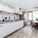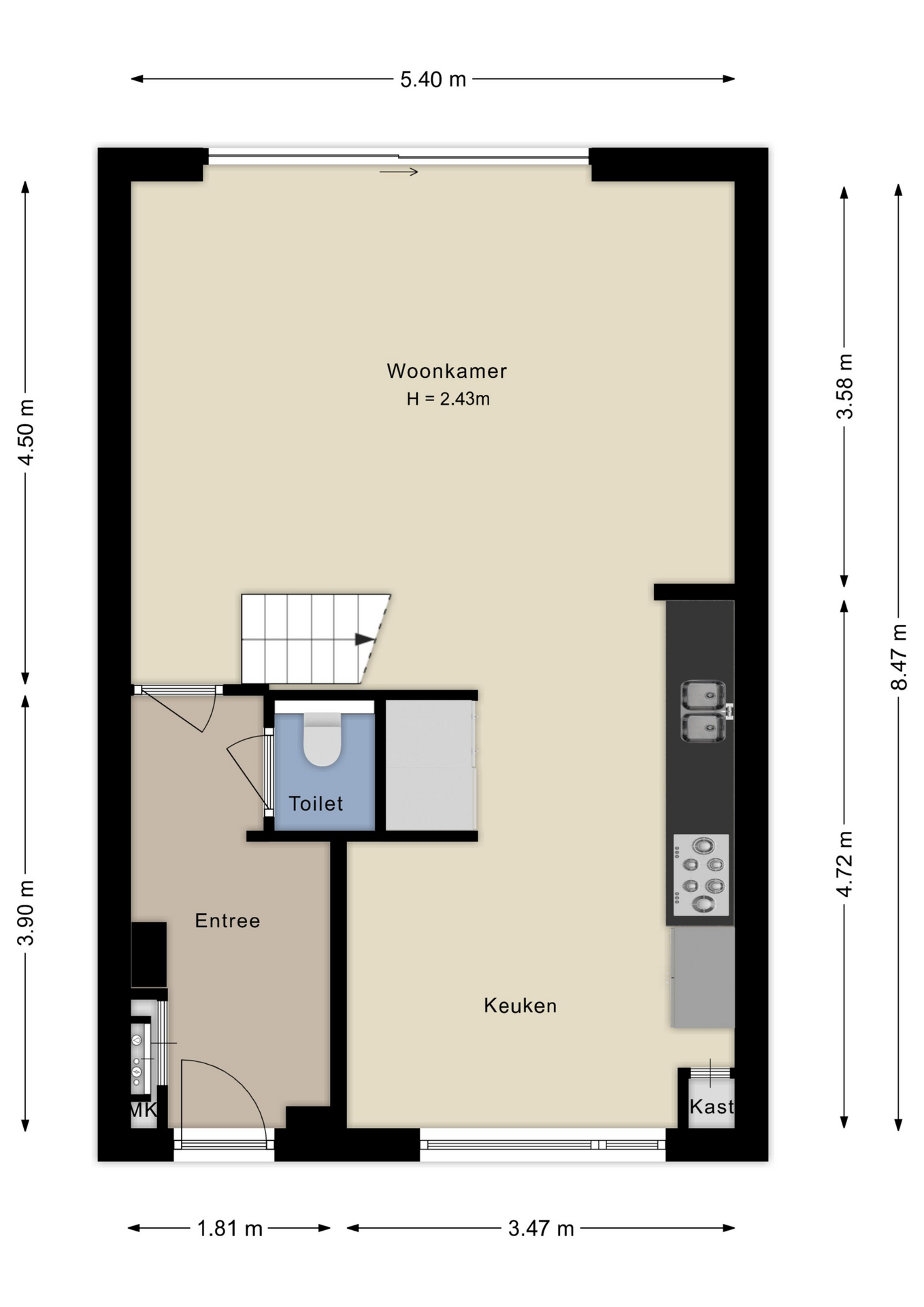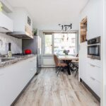 Binnenkomst in de hal met meterkast, garderobe en toiletruimte. De lichte en ruime woonkamer heeft een prettige indeling en biedt direct zicht op de tuin. Aan de voorzijde bevindt zich de moderne open keuken met diverse inbouwapparatuur.