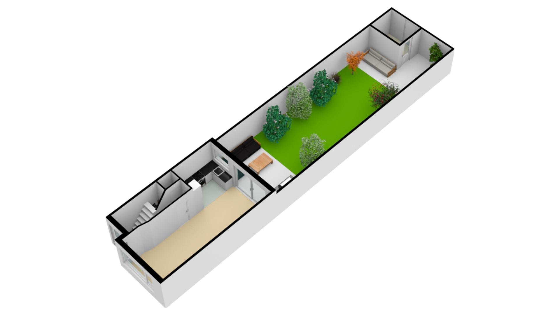 De diepe achtertuin is fraai aangelegd en wordt met liefde onderhouden. De berging zorgt voor de nodige opslagruimte en geeft toegang tot de achterom. De diepte van de tuin maakt dat je ondanks de ligging op het noodwesten de gehele dag van de zon kunt genieten.