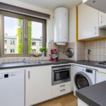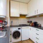 Loop je door naar de keuken, dan tref je er een praktische U-vorm hoekkeuken aan met aan drie zijden aanrecht met opbergruimte en apparatuur eronder weggewerkt. Langs twee muren heb je bovenkasten en er is ook nog een raam. In de keuken heb je de warmwatervoorziening, de oven, aansluitpunten voor de vaatwasser (2022) en de wasmachine, de wasbak en een gasfornuis met in het bovenkastje de afzuigkap weggewerkt. Vanuit de keuken heb je toegang tot het balkon dat op de binnentuin uitkijkt. Vanuit de keuken heb je toegang tot het balkon op de avondzon.