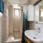 Aan het einde van de lange hal – tussen de grootste slaapkamer en de woonkamer – bevindt zich de volledig betegelde badkamer. Er is een douche en een wastafel. De badkamer is voorzien van een raampje dat voor natuurlijke ventilatie in deze sanitaire ruimte zorgt.