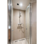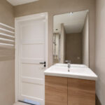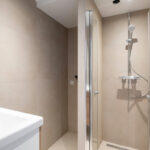 De nieuwe badkamer is strak afgewerkt en voorzien van een inloopdouche, wastafelmeubel en aansluiting voor de wasmachine.