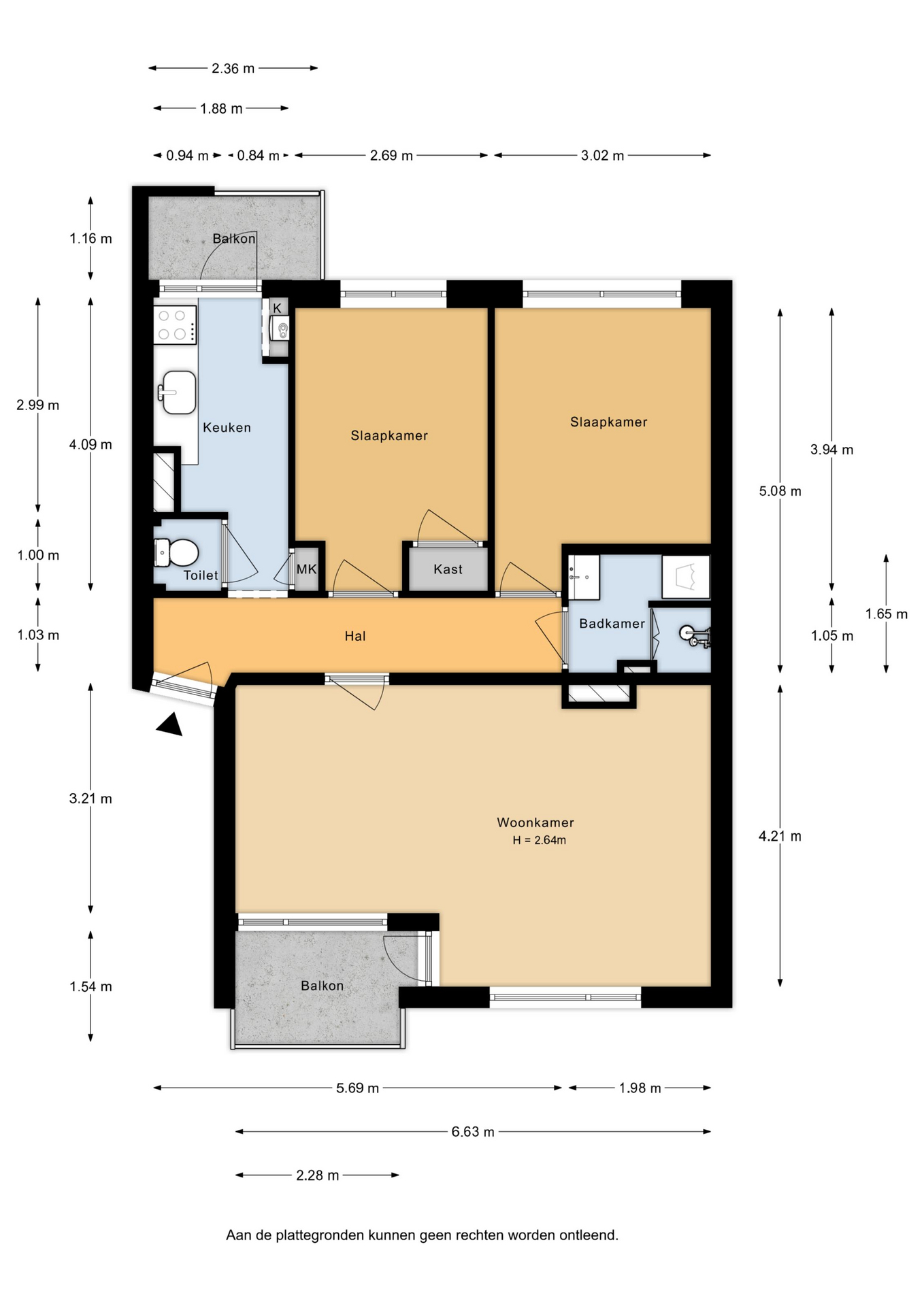 Aan de voorzijde bevindt zich de lichte woonkamer met openslaande deur naar het balkon en ruimte voor zowel een zit- als eethoek.