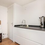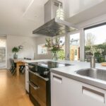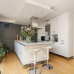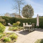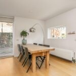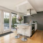 Dankzij de overstek aan de kopse kant van het eiland is het mogelijk om er krukken te plaatsen en aan het kookeiland te zitten. Daarnaast is er voldoende ruimte voor een grote eettafel. Via de openslaande deuren loop je zo de fraai aangelegde achtertuin in, waarmee de binnen- en buitenruimte met elkaar worden verbonden.