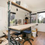 Op zolder heb je een mooi uitzicht over het groen en de Metaalkathedraal. Om daar optimaal van te kunnen genieten hebben wij een podium gebouwd waarop de slaapbank staat. Heerlijke plek om je terug te trekken.