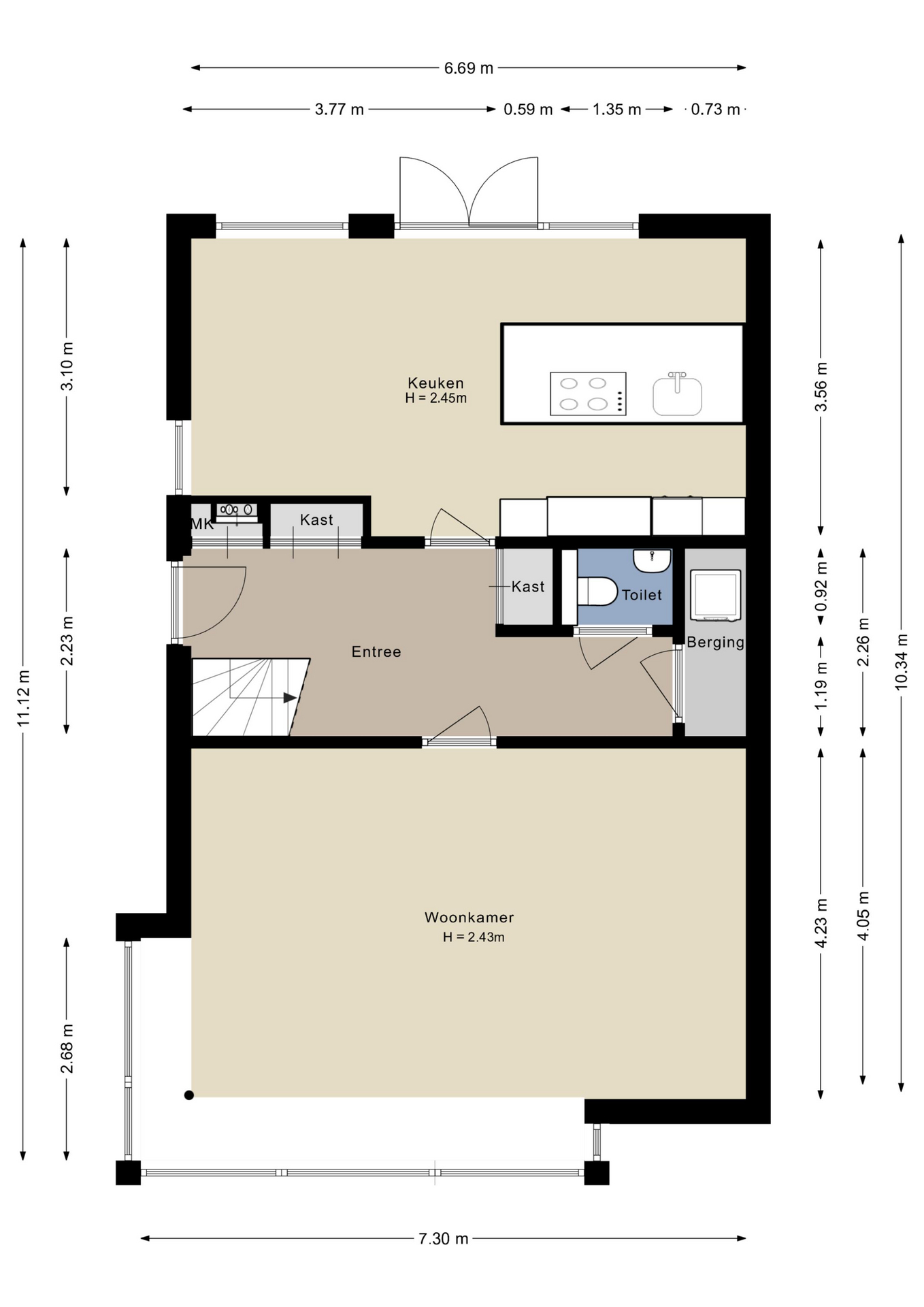 Aangekomen bij de woning is het mogelijk te parkeren op het eigen terrein of op de openbare parkeerplaats(en) voor de deur. Op het eigen terrein is een elektrische laadpaal (3 fasen, max. 18 kW) te vinden. Binnengekomen in de hoge, riante hal krijg je toegang tot de meterkast, (verborgen) garderobekast, inbouwkasten, trapopgang, toilet, interne berging, woonkamer en de eetkamer/keuken. De woonkamer bevindt zich aan de voorzijde en beschikt over grote raampartijen, waardoor er een prachtig en weids uitzicht is over het Archeologiepark! Daarnaast komt er veel natuurlijk daglicht de woonkamer binnen.
