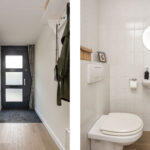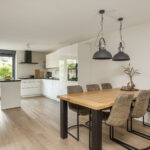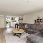 Via de hal met de toiletruimte, meterkast en trapopgang bereik je de riante woonkamer met een sfeervolle houtlook pvc vloer, hoge plinten en strak gestucte wandafwerking. Aan de voorzijde van de woning bevindt zich de luxe open keuken (2022), die is voorzien van diverse inbouwapparatuur zoals een Quooker, afzuigkap, combi-oven magnetron, inductie kookplaat, koelkast, vriezer en een fraai eiland met bar voor een ontbijt of glas wijn tijdens het koken.