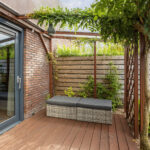 • Zonnige achtertuin op het zuiden met veranda met hardhouten vlonderterras, poort achterom, en schuur met 2 zonnepanelen;