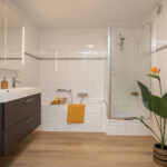 • Spacious bathroom (7.6 m2) with bathtub, shower, and double sink;