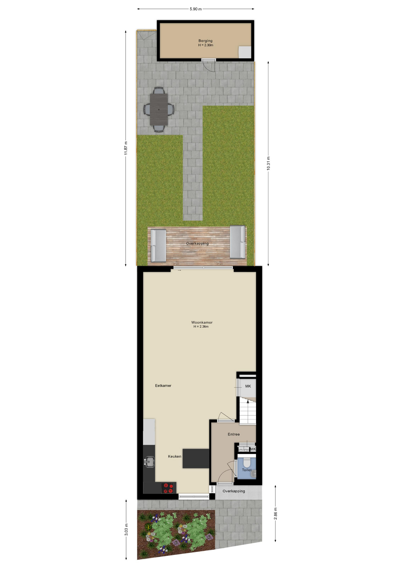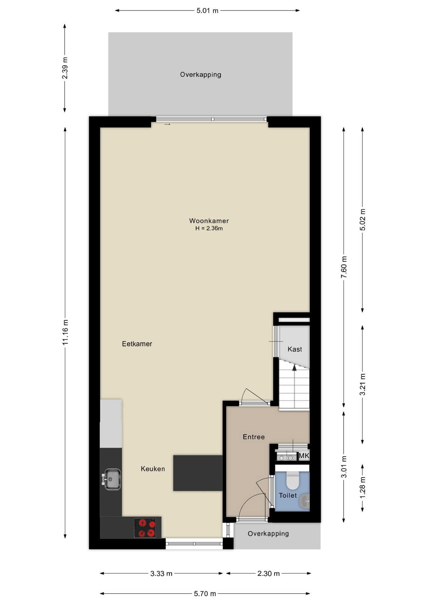 • Woonkamer van 5.70m breed met een schuifpui naar de tuin;