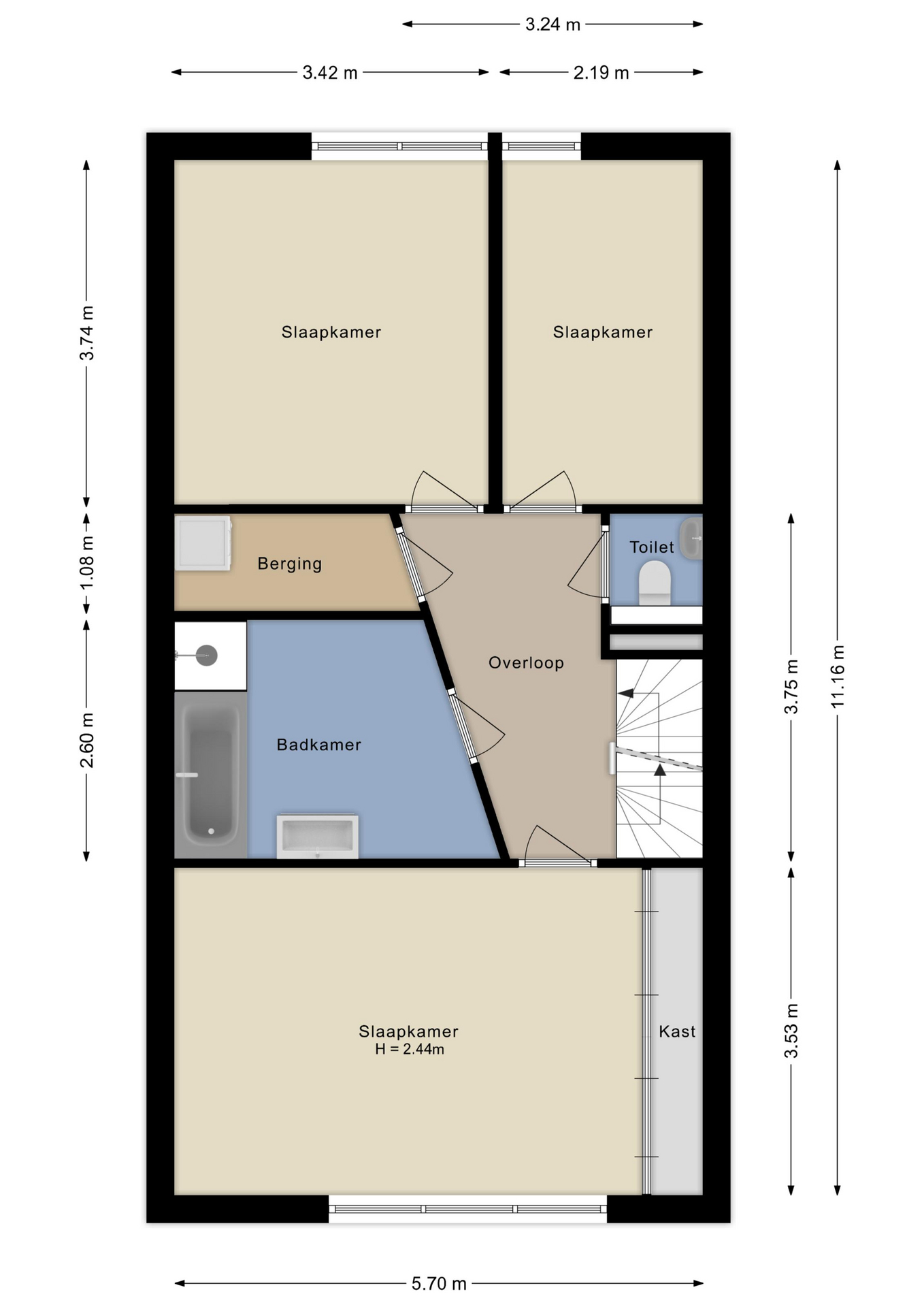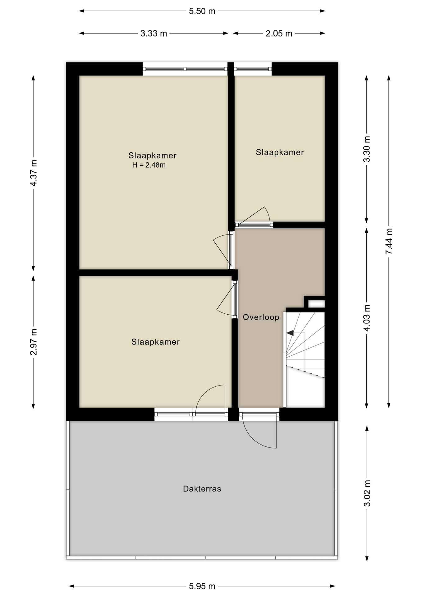 De vaste trap leidt naar de tweede verdieping waar in 2024 middels een dakopbouw een volwaardige extra woonlaag is gecreëerd. De drie ruime kamers (15, 10 en 7 m2) kunnen gebruikt worden als werkkamers, hobbyruimtes of extra slaapkamers, ideaal voor grote gezinnen. Tevens bestaat de mogelijkheid om hier een extra badkamer en toilet te realiseren. Deze gehele verdieping is voorzien van strakke houtlook pvc vloer en strak gestucte wand-en plafondafwerking. Ook is er de mogelijkheid om zonnepanelen op de dakopbouw te installeren (dakconstructie is hierop aangepast en elektrische voorbereidingen zijn reeds getroffen).