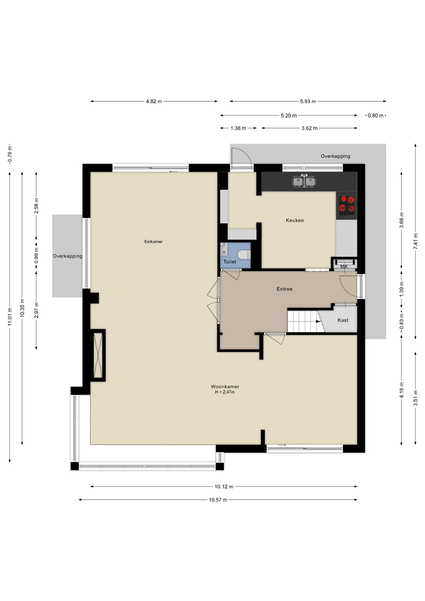 Via de eigen oprit bereik je de entree van de woning. De ruime hal geeft toegang tot de leefruimtes, het toilet, de meterkast en de trapopgang. Onder de fraaie massief notenhouten trap (2024) is een ruimte kast met opbergruimte voor huishoudelijke apparaten, de waterontharder en wijnvoorraad.