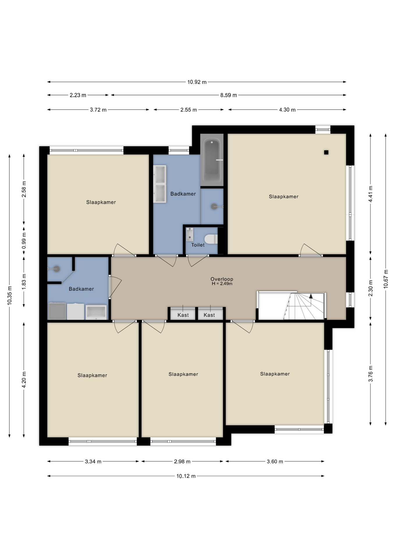 Op de eerste verdieping bevindt zich een royale en lichte overloop met inbouwkasten en hier bevinden zich de 5 grote en lichte slaapkamers met volop ruimte en flexibiliteit en de 2 badkamer en een apart toilet.