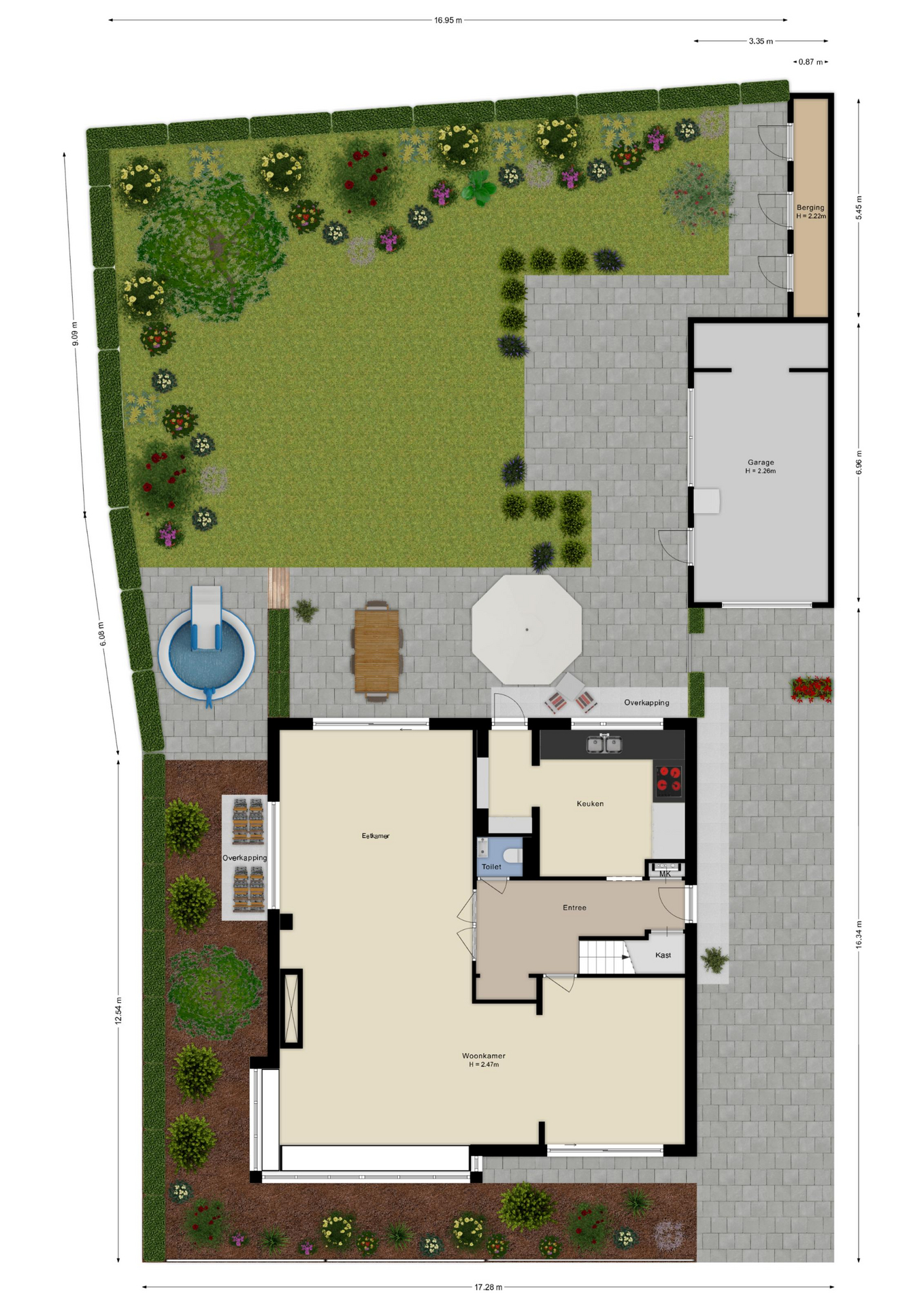 Daarnaast beschikt het perceel over een geïsoleerde garage en aangebouwde tuinkasten en een eigen oprit voor 3 auto's met een eigen elektrische laadpaal.