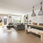 Voortuin met sfeervol vlonderterras en uitzicht op het groene, autovrije plantsoen. Entree via de voordeur naar de hal met meterkast, moderne toiletruimte, trapkast en toegangsdeur naar de ruime, uitgebouwde woonkamer. De gehele begane grond is voorzien van een stijlvolle eiken houten parketvloer, met uitzondering van de keuken, waar karakteristieke Portugese tegels zijn gelegd. Aan de voorzijde bevindt zich de moderne open keuken met openslaande deuren naar het vlonderterras en uitzicht op het plantsoen. De keuken is voorzien van diverse inbouwapparatuur en uitgerust met een BORA inductiekookplaat met geïntegreerde afzuiging, Quooker, combi oven/magnetron, vaatwasser (Bosch) en een grote koel-/vriescombinatie. Tevens is er een sfeervolle houtkachel aanwezig en dubbele openslaande deuren naar de tuin.