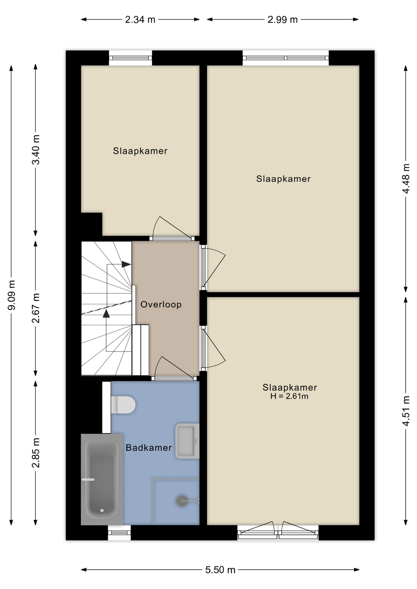 Overloop met toegang tot drie volwaardige ruime slaapkamers en de badkamer met ligbad, inloopdouche, wastafel en tweede toilet. De badkamer heeft een raam voor natuurlijke ventilatie en daglicht, tevens is er mechanische ventilatie aanwezig. Deze verdieping is volledig voorzien van een nette houten parketvloer.