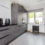 Aan de straatzijde bevindt zich de luxe halfopen keuken (2022) in stijlvolle antracietkleur. Deze is volledig uitgerust met een Pertazzoni inductiefornuis van 90 cm inclusief oven, combi-oven, 2 koelkasten, vriezer, vaatwasser en afzuigkap.