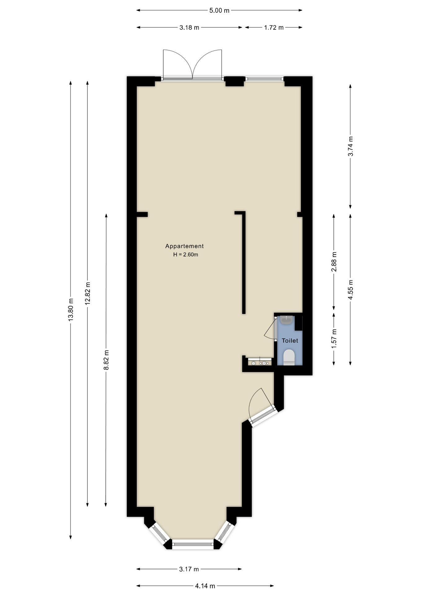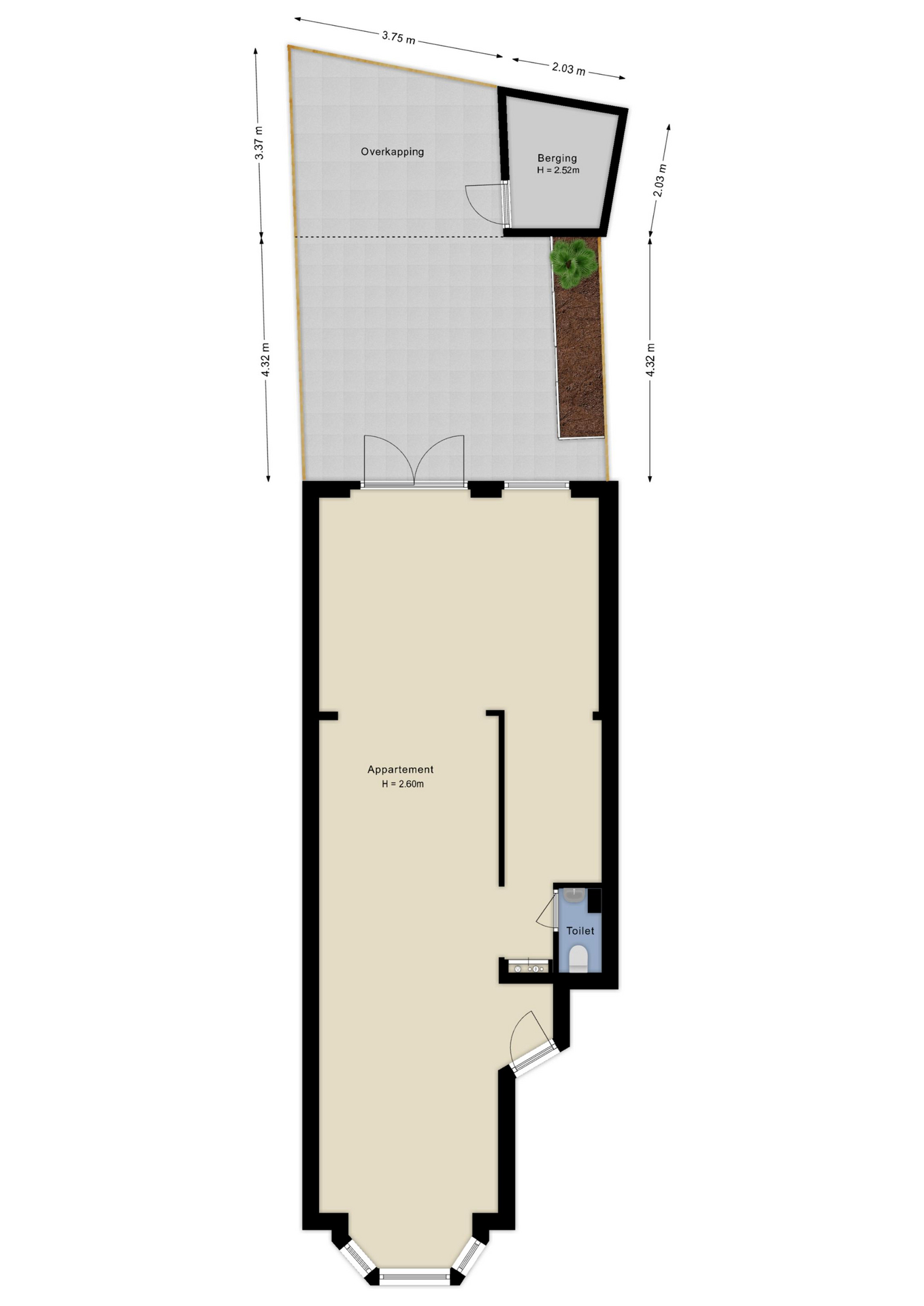 INDELING APPARTEMENT: Entree in open ruimte met aan de voorzijde een erker en in de uitbouw openslaande deuren naar de tuin. In de ruimte is een apart toilet met fontein en een meterkast geplaatst. Verder is de open ruimte eenvoudig in te delen als een 2-kamerappartement met (open) keuken, slaapkamer en badkamer.