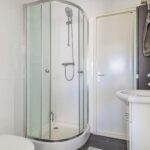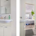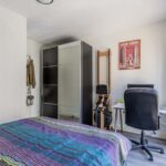 De badkamer bevindt zich tussen de woonkamer en de slaapkamer en beschikt over een toilet, douche en wastafel meubel De slaapkamer tenslotte is zeer royaal en biedt ruimte voor kasten, een werkplek en een tweepersoons bed en is gelegen aan de straatzijde.