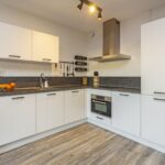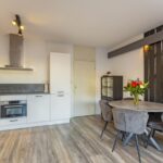 De open keuken is in 2018 vernieuwd, geplaatst in een L-opstelling, heeft mat witte kastjes en een donkergrijs betonlook aanrechtblad. De keuken is voorzien van diverse (inbouw)apparatuur; inductie kookplaat, RVS afzuigkap, combimagnetron, koel-vriescombinatie en een vaatwasser.