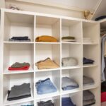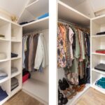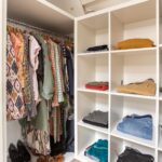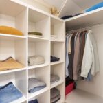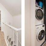 Overloop met laminaatvloer, glad gestucte wanden, inloopkast en vaste kast met wasmachine- en drogeraansluiting, CV-opstelling en mechanische ventilatie-unit.