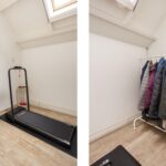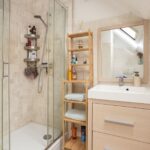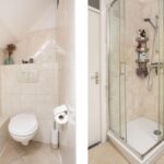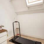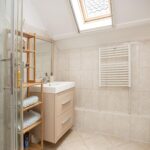 De modern afgewerkte badkamer is voorzien van een douchecabine met thermostaatkraan, badmeubel met wastafel, hangend cloiset, designradiator en Velux dakraam.