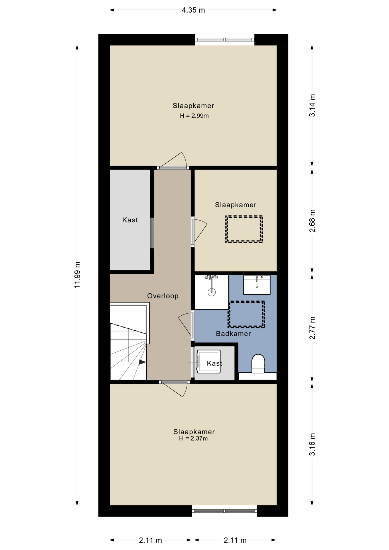 De woning beschikt over drie ruime slaapkamers die allen zijn voorzien van een laminaatvloer en glad gestucte wanden. De slaapkamers aan de voor - en achterzijde strekken over de gehele breedte van de woning. De slaapkamer aan de voorzijde is tevens voorzien van een luik met vlizotrap naar de ruime bergvliering en de slaapkamer aan de achterzijde is voorzien van kunststof kozijnen.