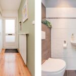 Via de voordeur bereik je de ruime hal met toegang tot de toiletruimte, meterkast, trapopgang naar de tweede verdieping en woonkamer. De toiletruimte heeft een hangend toilet en fonteintje.