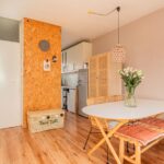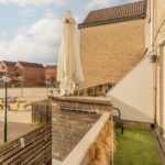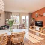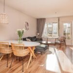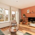 De woonkamer van circa 26 m² is zeer licht door de grote raampartijen aan de achterzijde. Via een deur is het balkon bereikbaar.