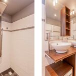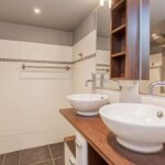 De badkamer is voorzien van een dubbele wastafel, grote inloopdouche en design radiator.