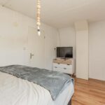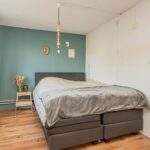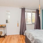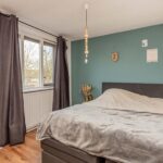 De slaapkamer aan de voorzijde ligt over de volledige breedte van de woning, is circa 12m² groot en voorzien van houten kozijnen met dubbel glas.