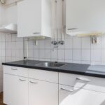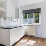Vanuit de woonkamer is toegang tot de open keuken aan de voorzijde van de woning. De keuken is voorzien van een standaard keukenblok. Fijn is de aanwezigheid van het raam, ideaal voor natuurlijke ventilatie.