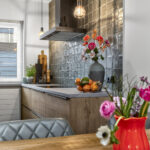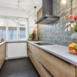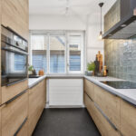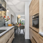 De halfopen keuken is aan de voorzijde gelegen en in 2022 voorzien van een modern en stijlvol keukenblok in dubbele opstelling met veel werk- en kastruimte en mooie tegelwand. De hoogwaardige inbouwapparatuur bestaat uit een koel-/vriescombinatie, inductiekookplaat, combimagnetron, RVS-afzuigkap en vaatwasser.