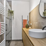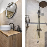 De prachtige en luxe afgewerkte badkamer is in 2022 geplaatst en voorzien van een ruime inloopdouche met glazen deur, regen- en handdouche en thermostaatkraan, een fraai badmeubel met waskom en spiegel en een designradiator.