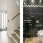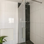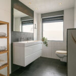 De ruime overloop geeft toegang tot de royale badkamer (2009) met inloopdouche, dubbele wastafel, toilet en inbouwspots.