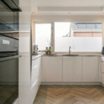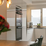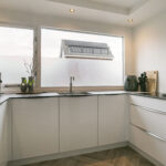 Aan de voorzijde bevindt zich de moderne U-vormige keuken (2019), compleet met inductiekookplaat, afzuiging, oven, combi-oven, koelkast, vaatwasser en quooker.