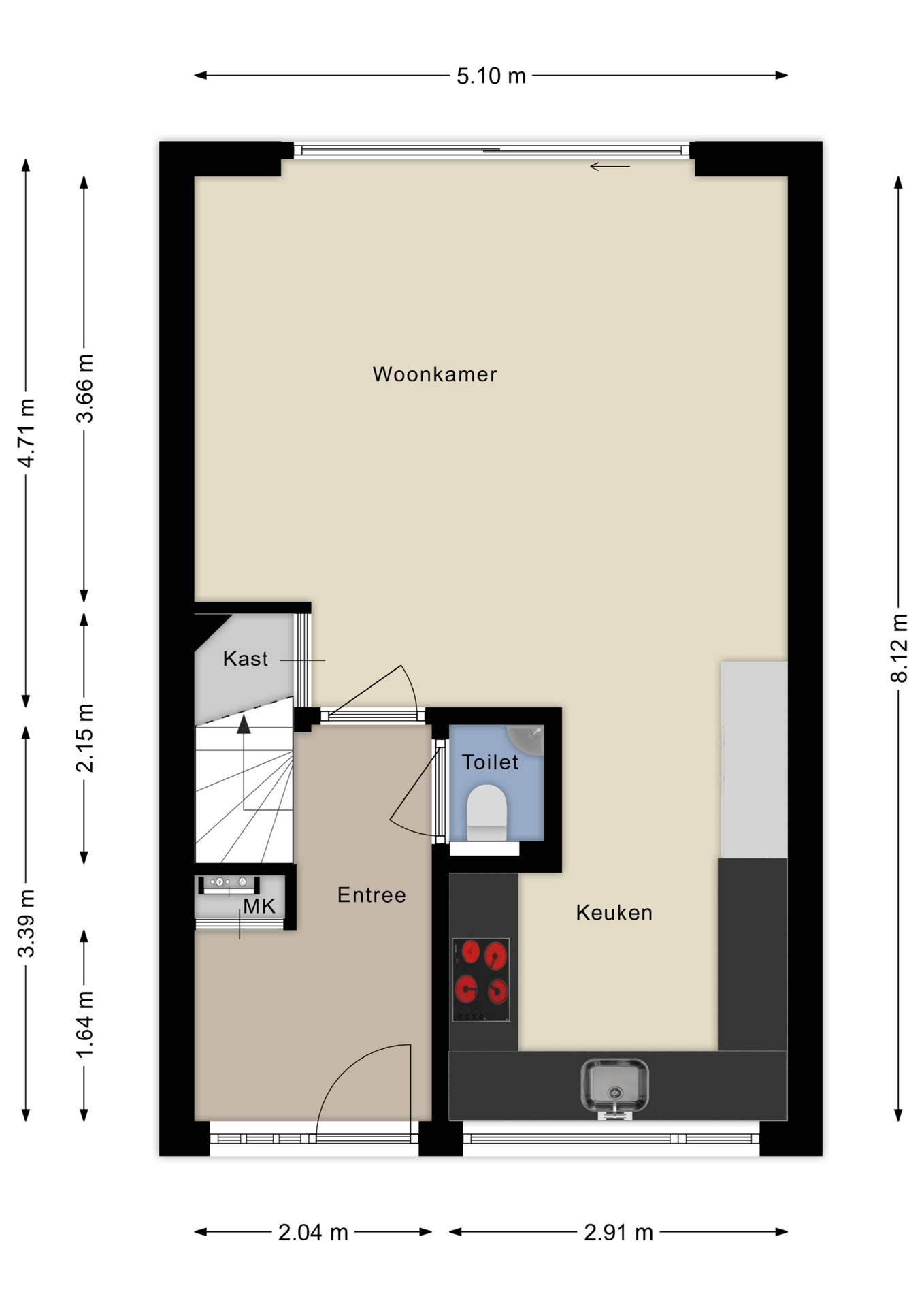Voor de woning vind je een ruime oprit voor twee auto’s en de entree van de woning. In de hal tref je een garderobenis, meterkast, toiletruimte en de trapopgang.