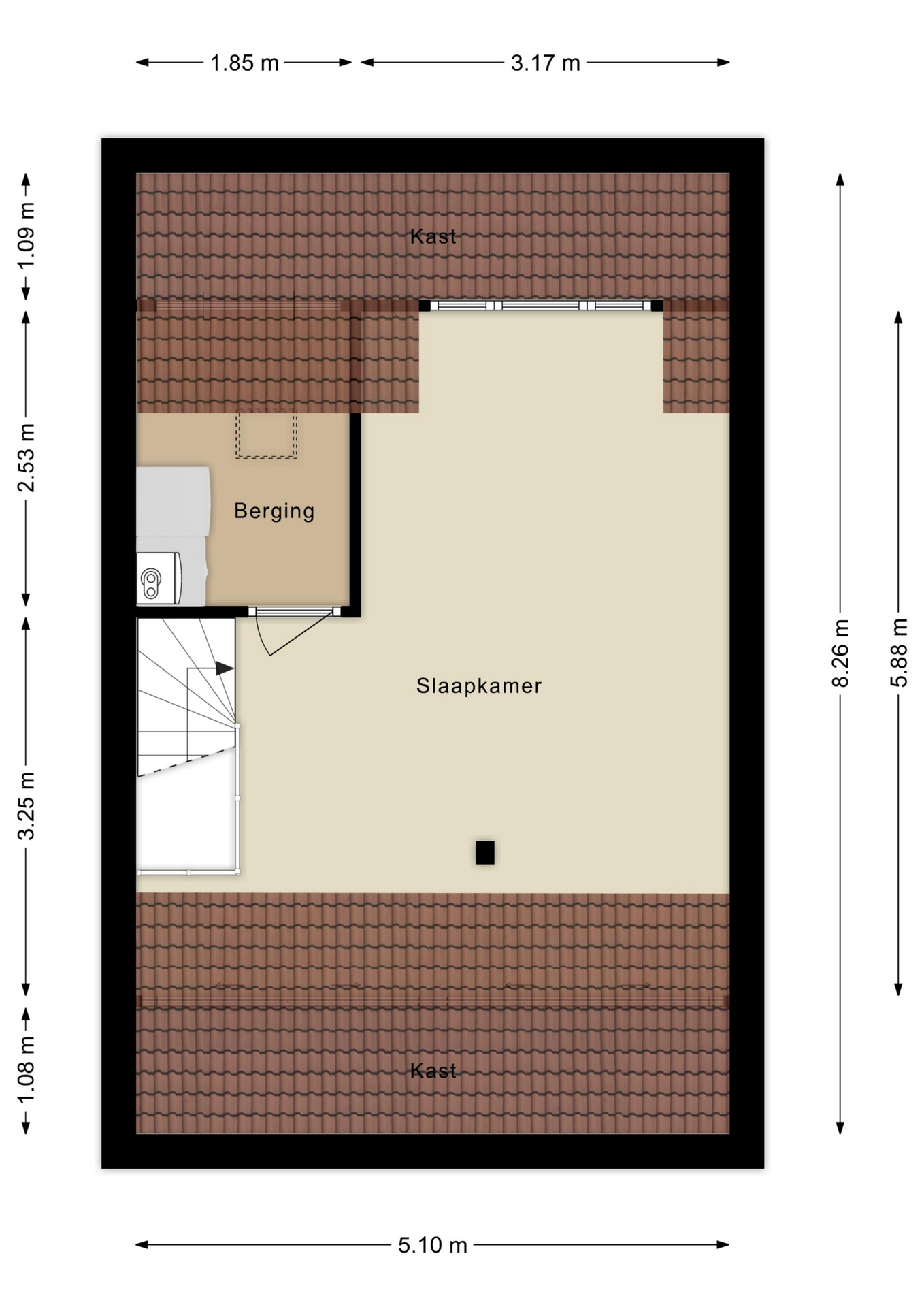 Via de open trap kom je op de lichte zolderverdieping met aparte wasruimte (2025 vernieuwd), cv- en wasmachineopstelling en voldoende bergruimte achter de schotten.