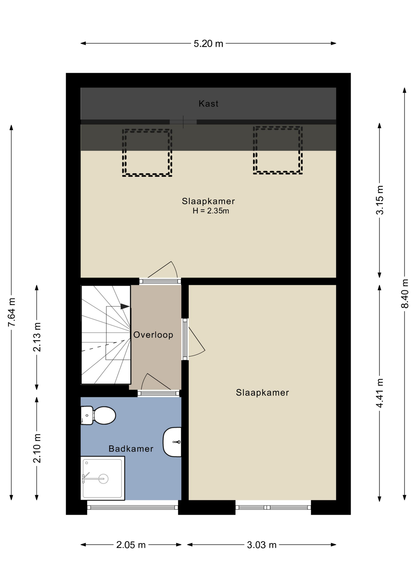 De overloop biedt toegang tot een tweetal goed bemeten slaapkamers, alsmede de badkamer met douche, toilet en wastafel.