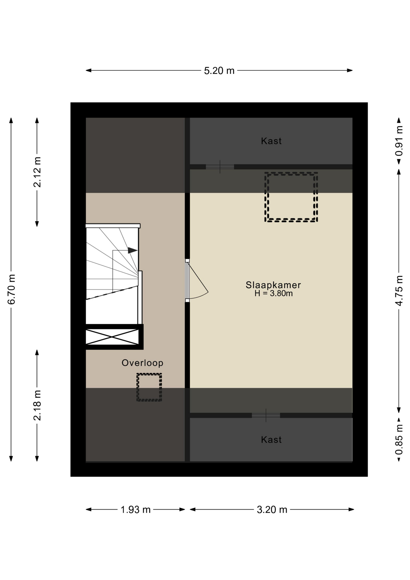 Via de overloop met wasmachine-aansluiting is de derde slaapkamer te bereiken. Deze verdieping beschikt tevens over diverse knieschotten.