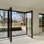 o Royale, lichte woonkamer met openslaande deuren naar terras.