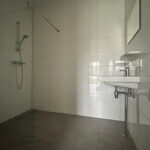 De ruime slaapkamer is een heerlijk rustige ruimte, ideaal voor rust en ontspanning. Het grote raam zorgt voor een prettige lichtinval, waardoor je in alle rust van je nachtrust kunt genieten. Wat dit appartement extra bijzonder maakt, is de moderne badkamer, die rechtstreeks vanuit de slaapkamer bereikbaar is. De badkamer is geheel betegeld en voorzien van een inloopdouche, wastafel en een handdoekradiator, wat zorgt voor zowel luxe als gemak.
