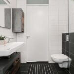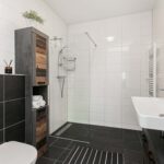 De badkamer is ruim en modern, afgewerkt met een dubbele wastafel, een ruime inloopdouche en een tweede toilet. Een fijne, verzorgde ruimte die zowel praktisch als comfortabel is.