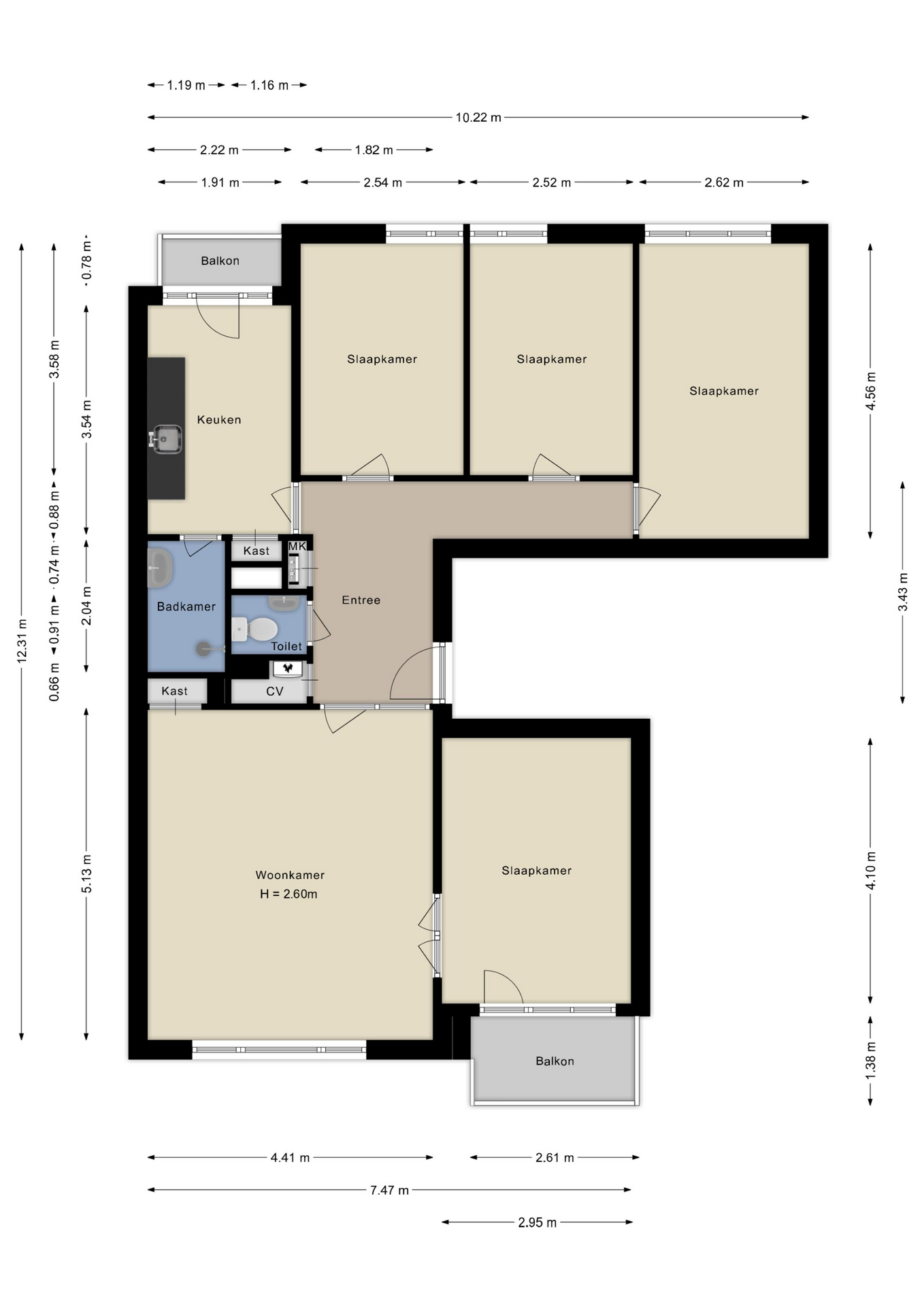Entree, hal met vaste kast voorzien van de opstelling voor de cv-combiketel en mechanische ventilatie-unit, meterkast. Lichte woonkamer met vaste kast en toegang tot de zij-/slaapkamer. Vanuit deze kamer bereik je het balkon, gunstig gelegen op het zuidwesten; ideaal voor de middag- en avondzon. De dichte keuken is voorzien van een eenvoudig keukenblok en een aansluiting voor de wasmachine. Vanuit de keuken is het tweede balkon bereikbaar, gelegen op het noordoosten. De nette badkamer beschikt over een douche en wastafel. Verder zijn er drie volwaardige slaapkamers aanwezig, wat het appartement bijzonder geschikt maakt voor diverse woonwensen.