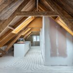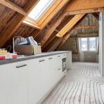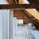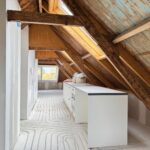 Entree: Je komt binnen in de centrale ruimte van de studio, waar direct de warme sfeer en het speelse karakter van het schuine dak opvalt.