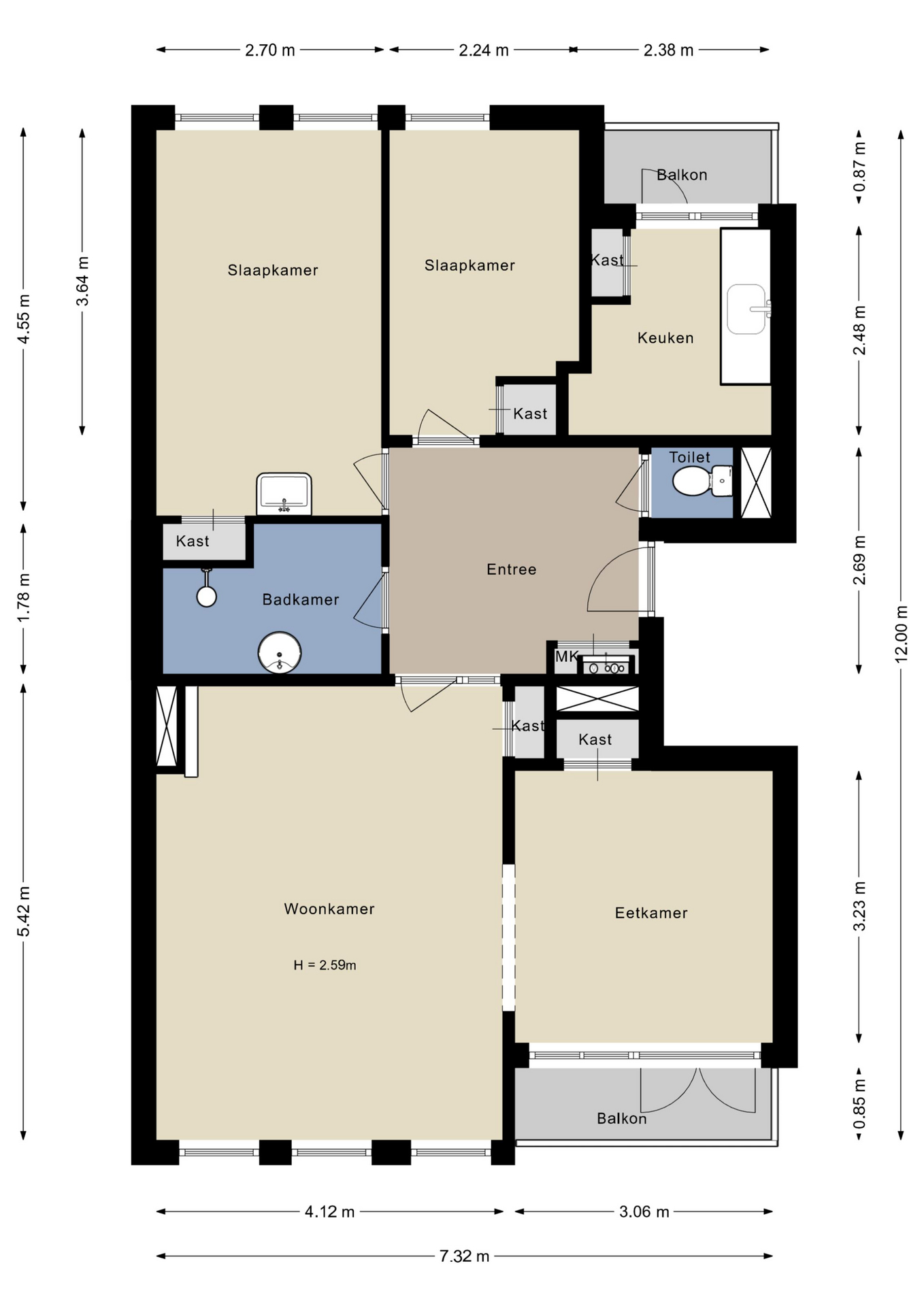 Ruime entree/hal met intercominstallatie, toiletruimte, meterkast/cv-ruimte. De dichte keuken is voorzien van een eenvoudig keukenblok en een praktische vaste kast. Vanuit de keuken is het balkon aan de noordwestzijde bereikbaar; ideaal voor een kopje koffie in de middagzon. De woonkamer is licht en ruim, met een vaste kast en een authentieke schouw. Dankzij het extra zijraam geniet je hier de hele dag van een mooie lichtinval. Via de zijkamer, die eveneens beschikt over een vaste kast, stap je via openslaande deuren het tweede balkon op, gelegen op het zuidoosten. Er zijn twee ruime slaapkamers, elk voorzien van een vaste kast. In één van de slaapkamers is bovendien een wastafel aanwezig. De badkamer is deels betegeld en beschikt over een douche, wastafel en aansluiting voor de wasmachine.